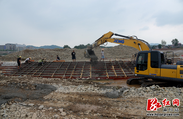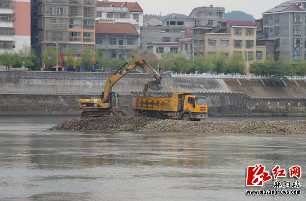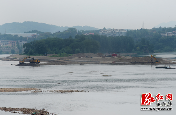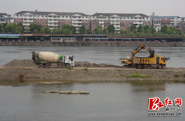 8月20日,记者在锦江河麻阳县城段猴子岩岛看到,数台挖土机、渣土车、水泥搅拌车正密切配合,有条不紊地铲运鹅卵石、修筑护岸,整个施工现场一派忙碌景象。