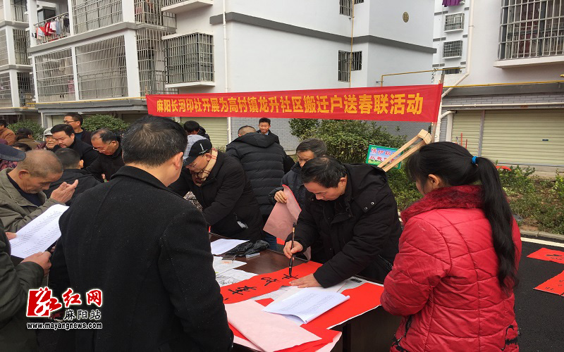 “易地搬迁通富路,开春稼穑沐新风”、“喜居宝地千年旺,福照家门万事兴”。……1月7日上午,高村镇龙升家园易地扶贫搬迁集中安置点内呈现出一派欢乐祥和的气氛,县书法家协会(长河印社)的书法名家挥毫泼墨,现场书写对联免费赠送给该小区内的966户搬迁户。