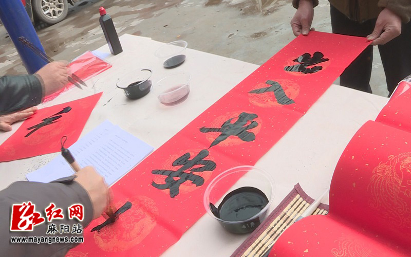 早上10点,黄桑乡亲爱村的村委会大院里,笔墨纸砚摆放整齐,来自我县硬笔书法家协会的4位书法名家现场挥笔写春联,只见书法名家们笔飞墨舞,或隶书或楷书或行楷,一张张笔体丰富的“福”字,一幅幅“出入平安顺风顺水顺人意,心想事成好年好景好前程”,“一帆风顺年年好,万事顺意步步高”的大红春联被前来的群众抢选一空。拿到春联的村民们兴高采烈、奔走相告、大家都争先恐后的赶到村部大院挑选自己喜爱的春联。